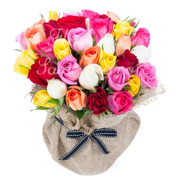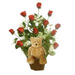Arreglo de 12 rosas rojas importada, lluvia, finos follajes y peluche.