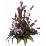 Arreglo con 20 rosas rojas, lilium rosado, ginger, heliconias, liriope y follaje verde.
