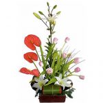 Arreglo con 10 tulipanes rosados, anturios rojos, lilium blancos y follaje.