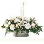 Centro de mesa con lilium blancos, claveles y follaje verde.