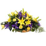 Centro de mesa con 12 rosas amarillas, 4 lilium amarillos, 9 iris y follaje verde.