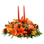 Centro de mesa con 6 rosas naranjas, lilium naranjas, 4 gerberas naranjas, astromelias amarillas, pompos rojos y follaje verde.