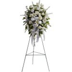 Corona con rosas, lilium, astromelias blancas, hortencias, pompos y copa de nieve y follaje + Lazo.