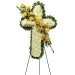 Cruz con 12 rosas amarillas, pompos y follaje verde.