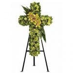 Cruz Especial con 6 Orquídea Cymbidium amarillas, liriopes, hortensia, hoja de dracenia y follaje verde. Mide: 1.50mt.