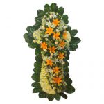 Cruz Especial con 12 rosas melón, lilium melon, hortensias, azucenas, copa de nieve, liriopes, hoja de dracenia y follaje verde.