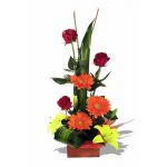 Arreglo con 3 rosas rojas, 3 gerberas naranjas, lilium amarillo y follaje verde.