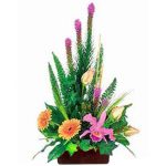 Arreglo con 1 orquídea, 3 rosas, 2 gerberas naranjas, leatriz y follaje verde.