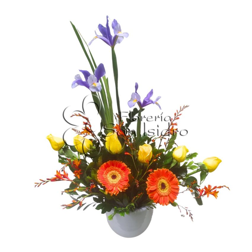 Arreglo con 6 rosas, iris, gerbera y follaje verde.