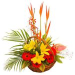 Canasta con lilium amarillos, 6 gerberas rojas, heliconias, achileas, palmeras y folleje fino.