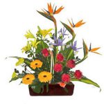 Arreglo con 3 lilium amarillo, 6 rosas rojas, 3 gerberas naranjas, 3 esterlicas, 3 iris, achilea y follaje verde.