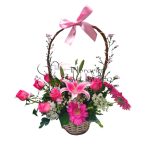 Hermosa canasta floral con rosas, gerberas, lirio, flores decorativas y follaje verde, decorado con lazo.