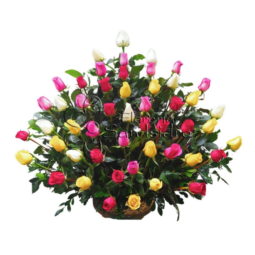 Espectacular arreglo floral en diseño abanico con 50 rosas de colores y follaje verde.