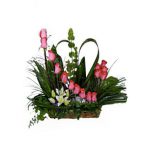 Arreglo con 18 rosas rosadas, lilium blancos y follaje verde.