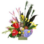 Arreglo con 2 anturios, lilium stargazer, hortensias, 10 cartuchos, heliconias, leatriz y follaje verde.