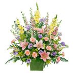 Arreglo con lilium stargazer, claveles, dogos, astromelias, gladiolos, achileas, y follaje verde.