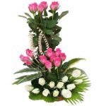Arreglo con 36 rosas, 12 rosas blancas y 24 rosas rosadas con follaje verde.