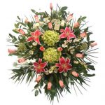 Lagrima con rosas rosadas, lilium, astromelias, hortensias, copa de nieve, lluvia y follaje verde.