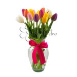 Jarrón con 15 tulipanes de colores, decorado con lazo.
