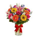 Elegante Florero con 6 rosas, gerberas, girasoles, lirios, flores decorativas y fino follaje, decorado con lazo.