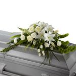 Manto Especial con 10 tulipanes, 12 rosas blancas, lilium blancos, claveles, astromelias, hortensias y follaje verde.