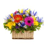 • Arreglo floral con 3 Lirios amarillos, iris, gerberas, flores decorativas y follaje verde.
