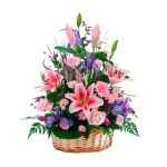 • Arreglo floral con 6 Rosas rosadas, 2 lirios, gerberas, iris, flores decorativas y follaje verde.