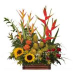 Arreglo con 6 rosas rojas, 2 girasoles, esterlicias, 2 gerberas, heliconias, achileas, 5 maracas, liriope y follaje.