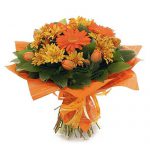 Ramo con 10 tulipanes naranja, 3 gerberas, margaritas, follaje, envuelto en tela y lazo.