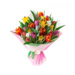 Exclusivo ramo de 25 tulipanes de colores variados y follaje, decorado con tela y lazo.